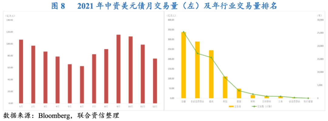 2021年中資美元債共達成交易72,042筆,累計交易額高達1,062.9億美元,月均交易量在90億美元附近,其中金融債[6](包括地產債)是中資美元債市場交易熱度最高的債券種類,年度交易額達337.4億美元,占總交易額的31.7%,非必需消費品美元債和通訊美元債也是熱門交易券種,年交易額分別為288.6億和244.6億美元,三者交易量合計占總交易量的80%以上。