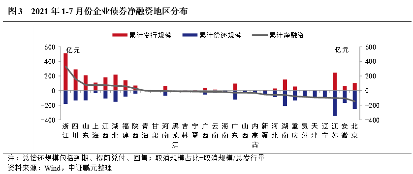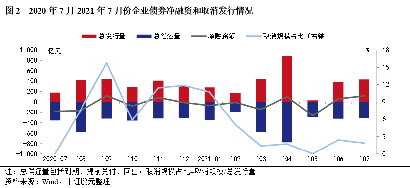 從凈融資情況來看,7月企業(yè)債券總發(fā)行規(guī)模430.70億元,總償還規(guī)模314.51億元,本月表現(xiàn)為凈發(fā)行116.19億元,上年同期為凈償還180.52億元。此外,2021年7月有1只企業(yè)債券取消發(fā)行,原計(jì)劃發(fā)行規(guī)模8億元。2021年1-7月份,企業(yè)債凈融資表現(xiàn)為凈償還207.89億元,較上年同期凈償還規(guī)模減少923.21億元。