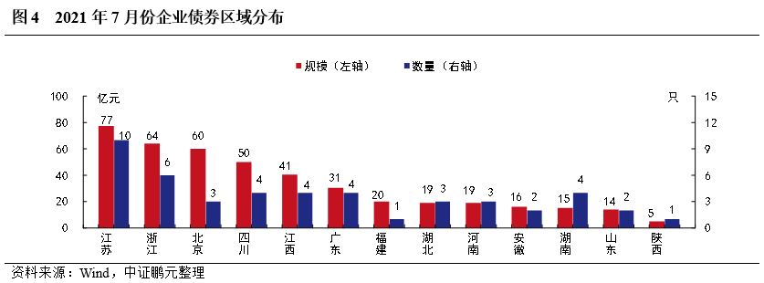 2021年7月,共有13個(gè)省份發(fā)行了企業(yè)債券。其中,江蘇省發(fā)行77.30億元,規(guī)模高于其他省份,其次,浙江省和北京分別發(fā)行64億元、60億元。從發(fā)行數(shù)量上看,江蘇省發(fā)行10只,浙江省發(fā)行6只,其他省份發(fā)行數(shù)量較少。與上年同期相比,7月發(fā)行省份較上年同期均出現(xiàn)增長,其中,四川省、江蘇省和北京發(fā)行規(guī)模同比增長300%以上,江蘇省增速287%,漲幅也較大。