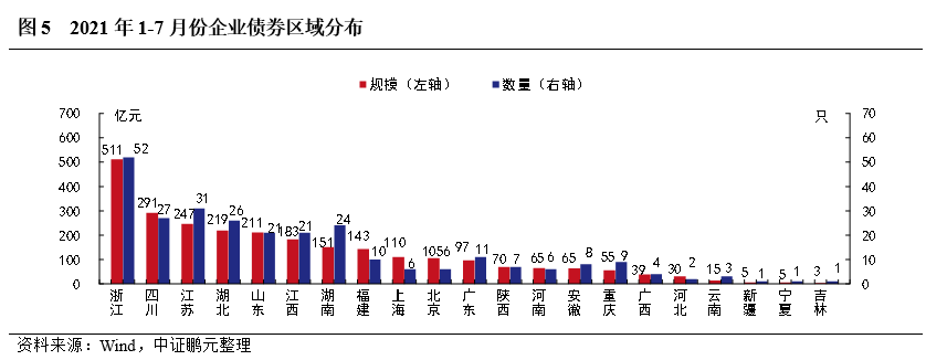 綜合2021年1-7月份看,浙江省發(fā)行規(guī)模最大,累計(jì)511.40億元,發(fā)行數(shù)量52只;四川省發(fā)行291.40億元,位列第二;江蘇省、湖北省和山東省分別發(fā)行246.80億元、218.80億元和211.10億元,規(guī)模也相對(duì)較大。與上年同期相比,有10個(gè)省份的企業(yè)債發(fā)行規(guī)模同比增加,其中,浙江省同比增加289%,漲幅最大,其次是江西省和山東省分別增長132%和128%;共有7個(gè)省份的企業(yè)債發(fā)行規(guī)模同比下降,其中,云南省、陜西省和廣東省分別同比下降77%、61%和59%,降幅較大。此外,貴州、天津、山西、甘肅和海南省本年未發(fā)行。