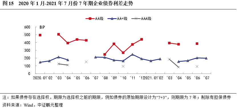 從趨勢(shì)看,7年期除權(quán)無擔(dān)保企業(yè)債,7月份AA+級(jí)利率利差微幅下調(diào),其他級(jí)別未發(fā)行。