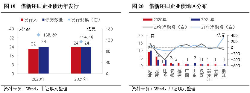 從地區(qū)分布看,借新還舊企業(yè)債主要分布在湖北,發(fā)行數(shù)量占比分別為40%,除湖北外,湖南、江蘇兩省發(fā)行數(shù)量次之,但2020年和2021年企業(yè)債凈融資為負(fù),地區(qū)存續(xù)主體再融資壓力較大。整體看,借新還舊企業(yè)債發(fā)行主體主要位于再融資壓力加大的省份,多為企業(yè)債發(fā)行規(guī)模較大的地區(qū)。
