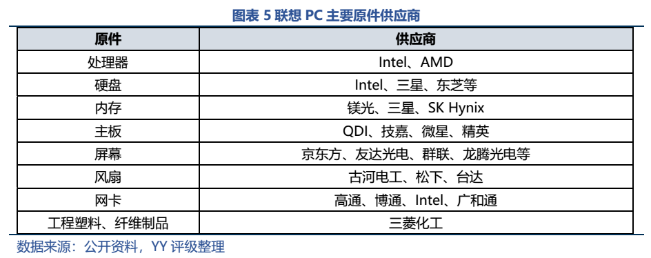 PC業務方面,聯想是全球最大的PC供應商,2020年出貨量7266.9萬臺,占全球市場份額的24.9%,第二大供應商惠普則占21.2%。在國內市場上,聯想更是保持絕對的領先優勢。不過由于處理器、硬盤、內存等元件都是源于外購,因此聯想一直被詬病為“組裝廠”。