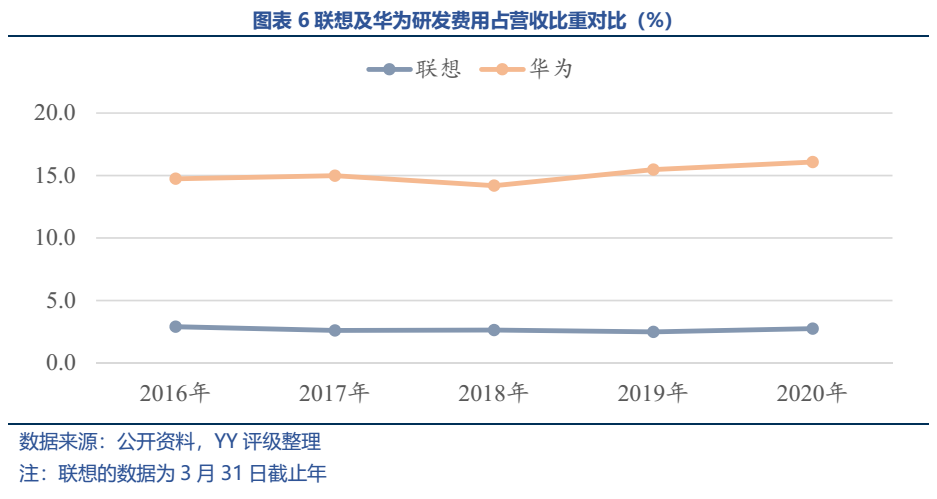 聯想的研發費用占營收比重與華為等專精技術的企業形成了鮮明對比,聯想的研發費用占比僅在2%-3%之間,而華為的研發費用占比持續在14%以上,而2020年科創板企業研發費用占比的中位數也達到8%。