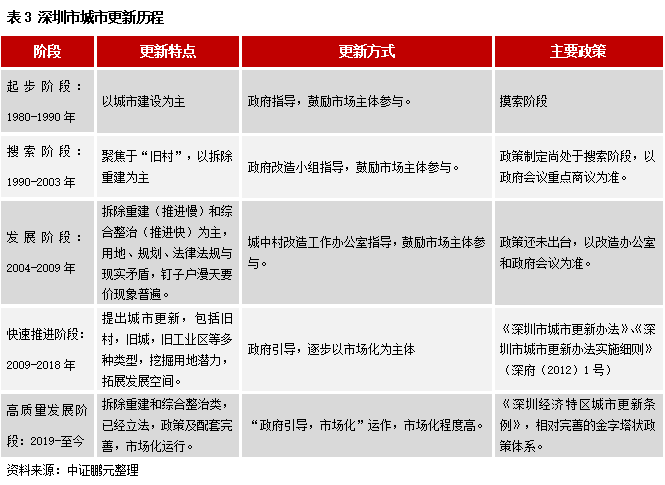 與國外主要發達城市相比,城市更新演變歷程相似,我國城市更新也大體分四個階段:萌芽、起步、探索、提速。萌芽階段以增加居住、生活空間為主,滿足基本的居住空間需要;起步階段以經濟建設為主,進行大規模的拆除重建;探索階段開始注重人文環境、城市功能改造,這時期以棚改、城中村改造為主,試點探索局部范圍改造,拆除重建仍占據較大比例;提速階段注重高質量發展,減少拆除重建,進行可持續發展的城市更新。我國城市更新推廣發展離不開深圳、廣州、上海等地的示范效應和傳導作用,具體來看看四個一線城市更新歷程和特點。