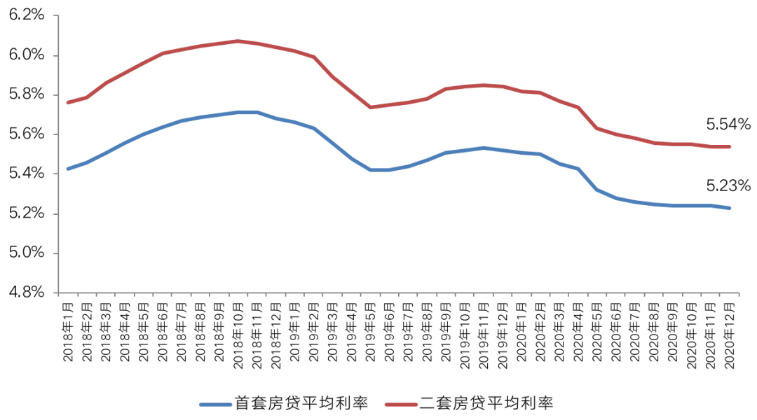 具體來看,上半年房地產信貸政策中性偏積極,央行三度降準釋放長期資金約1.75萬億元,并兩度下調LPR利率中樞,5年期以上LPR累計降幅達15個基點。受惠于信貸資金整體合理充裕,疊加LPR利率兩度下調,房貸利率趨勢性下滑。融360數據顯示,截至2020年12月,全國首套房貸平均利率5.23%,較2019年12月減少29個基點;二套房貸平均利率5.54%,較2019年12月減少30個基點。