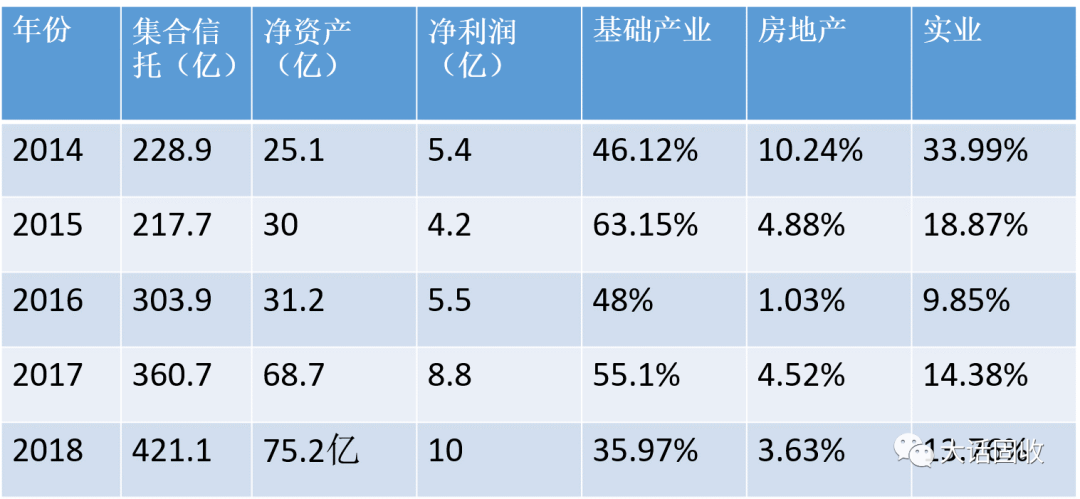 根據近5年的年報數據來看,財信信托業務主要以基礎產業和實業貸款為主。合計占比從2014年的80.11%,下降到2018年的49.73%,占比仍然近半。