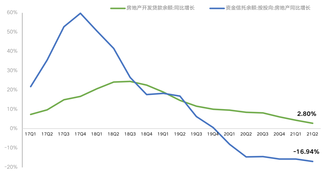 2020年房地產開發貸告別雙位數增長,增速大幅回落,至2021年二季度末,開發貸余額12.3萬億,同比增長2.8%,增速創下歷史最低值。房地產信托余額自2020年后進入負增長區間,截至今年二季度末房地產資金信托余額2.08萬億,同比下滑16.94%,創下歷史最大跌幅。