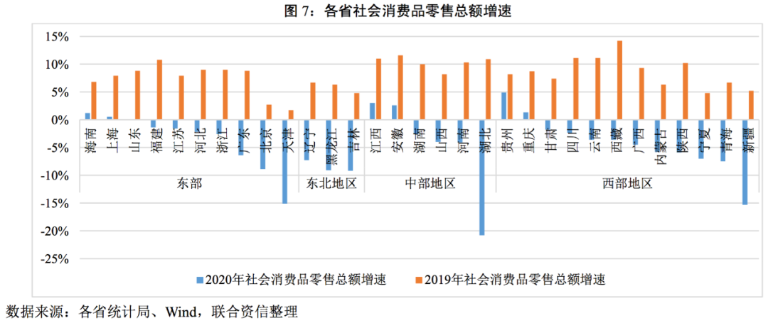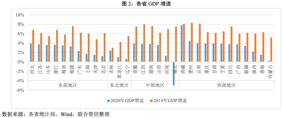 ?GDP總量在經(jīng)濟相對發(fā)達地區(qū)和欠發(fā)達地區(qū)的分化較為明顯,東部地區(qū)繼續(xù)維持領(lǐng)跑態(tài)勢;2020年,除湖北以外,其余30個省份GDP增速全部轉(zhuǎn)正,中西部地區(qū)增速分化更為明顯,東北地區(qū)經(jīng)濟恢復相對較慢,東部地區(qū)則相對較為均衡。