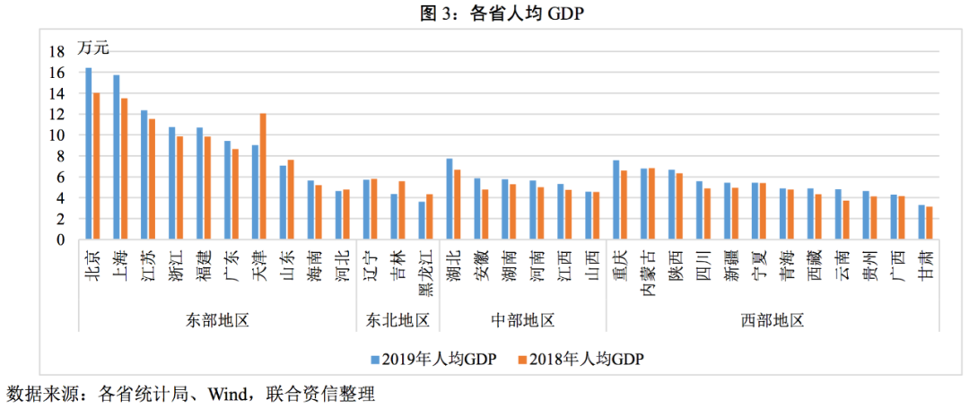 2020年各省份GDP規(guī)模變動不大,且人口流動短期內(nèi)并不會有趨勢性的變化,因此我們采用2019年的人均GDP進行觀察。從2019年人均GDP規(guī)模看,東部地區(qū)領(lǐng)跑全國,除了東部地區(qū)以外,其他地區(qū)沒有明顯分化。大部分省份人均GDP隨著經(jīng)濟規(guī)模的擴大而進一步提升,值得注意的是東三省以及天津、山東,2019年人均GDP較2018年反而下降,尤其是天津下降顯著,主要是因為天津及東三省的產(chǎn)業(yè)結(jié)構(gòu)均以石油化工、鋼鐵等傳統(tǒng)工業(yè)為主,而近些年隨著我國經(jīng)濟的轉(zhuǎn)型,傳統(tǒng)經(jīng)濟增長動力放緩,造成經(jīng)濟增長放緩、人均GDP下降。