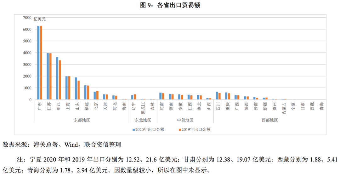 ?中部地區(qū)固定投資增速整體相對較高,除湖北以外均超過全國水平,西部分化較為明顯;東部、中部以及西部地區(qū)消費增速分化加劇,東北地區(qū)消費增速排名整體靠后;出口貿(mào)易主要集中在廣東、江蘇、浙江、上海、山東以及福建等東部地區(qū)沿海城市。