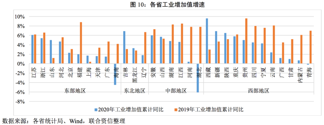 受疫情影響,2020年一季度全國工業(yè)生產(chǎn)幾乎停滯,二季度以來各地區(qū)經(jīng)濟逐漸恢復,但恢復進程存在差異。從全年工業(yè)增加值增速看,僅青海、海南以及湖北三個省份的工業(yè)增加值增速尚未轉(zhuǎn)正。分區(qū)域看,各區(qū)域內(nèi)的工業(yè)恢復程度不同,分化較為明顯。西藏受疫情影響較小,工業(yè)增加值同比增長9.6%,領(lǐng)漲全國,吉林和新疆以6.9%的增速并列全國第二。吉林的第一大產(chǎn)業(yè)是汽車制造,而2020年二季度以來汽車銷售生產(chǎn)持續(xù)火熱,從而帶動吉林的工業(yè)修復增速領(lǐng)先全國。與2019年相比,僅有7個省份工業(yè)增加值增速超過2019年,大部分省份工業(yè)生產(chǎn)尚未完全從疫情中修復,增速不及2019年同期水平,尤其是海南和湖北,其中湖北是因為受疫情影響最大,嚴重影響工業(yè)生產(chǎn)且復工慢于其他省份;而海南因為旅游業(yè)大幅萎縮導致相關(guān)的工業(yè)生產(chǎn)大幅下滑。