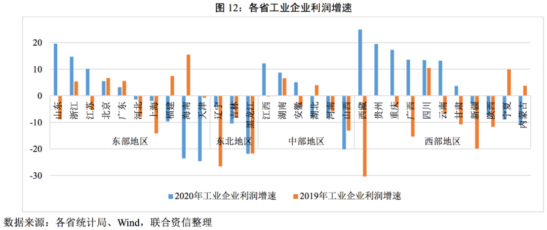 從企業(yè)利潤增速看,2020年工業(yè)利潤增速最大值與最小值差距為44.30%(2019年為42.1%),地區(qū)間的差異較2019年進一步加大。有15個省份工業(yè)企業(yè)利潤為負增長,較2019年減少3個省份;17個省份工業(yè)企業(yè)利潤增速超過2019年。分區(qū)域看,東部、西部和中部地區(qū)各省份分化均較為明顯,且有進一步加劇的趨勢,東北地區(qū)三省全部負增長,主要是因為2020年國際大宗商品價格不景氣在一定程度上壓縮黑色金屬以及石油開采及加工行業(yè)的利潤。