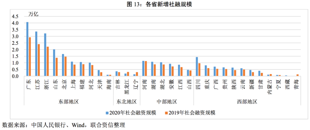 區(qū)域間的流動性分化明顯,GDP規(guī)模較大的省份獲得了更多的流動性支持。2020年,東部地區(qū)廣東、江蘇、浙江以及山東僅四個省份新增社融規(guī)模占全國新增社融的41.93%,東北地區(qū)新增社融規(guī)模比重只占全國新增社融的2.25%,地區(qū)間差異很大。整體看,2020年僅黑龍江、遼寧、內(nèi)蒙古以及青海的新增社融低于2019年水平,在全國新增社融大幅增長的背景下,上述四個省份的新增社融規(guī)模反而較2019年下降,進一步反映了資金的“擇優(yōu)”選擇性。從社融結(jié)構(gòu)看,各區(qū)域分化程度也較為明顯,東部地區(qū)對貸款的依賴度相較其他地區(qū)較低,直接融資比重較高;經(jīng)濟規(guī)模較小的省份,如青海、東三省,政府債券融資占比較高。