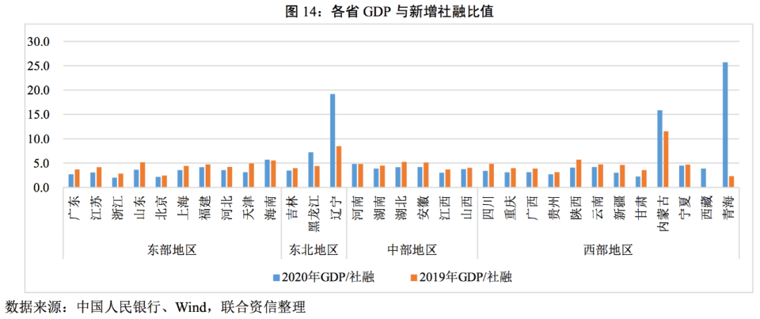 GDP與新增社融的比值可以衡量各省份的資本使用效率。從各省的數(shù)據(jù)看,大部分省份的資金并未有效拉動GDP的增長,如廣東、江蘇、浙江、山東等融資大省,資金使用效率較低,且與2019年相比進一步降低,與之相反的是,遼寧、內(nèi)蒙古、青海等經(jīng)濟規(guī)模較小的省份,資金使用效率較高,主要是由于這些地區(qū)的政府債券融資比重較大且經(jīng)濟規(guī)模較小,因此對經(jīng)濟的拉動效應較為明顯。