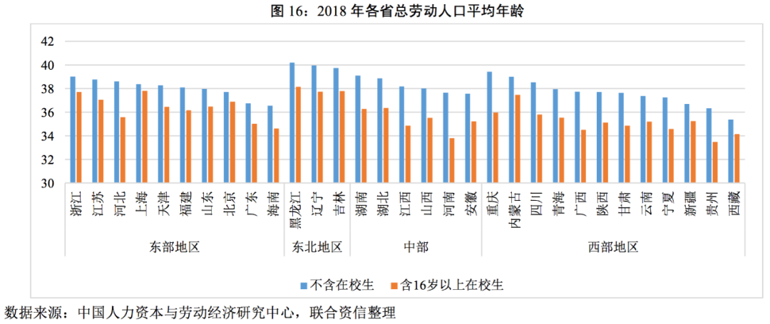 從勞動力人口來說,報告測算的數(shù)據(jù)顯示,1985-2018年間,全國勞動力人口(包括學生)的平均年齡從32.2歲上升到了38.4歲。平均年齡最高的前五個省份是黑龍江、遼寧、吉林、重慶、湖南;平均年齡最低的五個省份是廣東、新疆、海南、貴州、西藏。勞動人口的年齡分布基本與人口流動相一致,北京、上海等老齡化已逐步抬頭的較發(fā)達城市,得益于勞動力涌入而在該指標中排名中等;東北三省多年以來的人口流出使得該地區(qū)的勞動人口平均年齡顯著高于其他地區(qū)。
