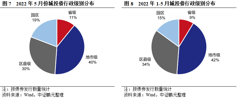 從行政級別分布來看,5月份省級和園區(qū)平臺發(fā)債數(shù)量相對增加,地市級和區(qū)縣級平臺債券發(fā)行數(shù)量占比下降。具體而言,省級平臺發(fā)行105只,占比11%,較上月上升1.7個百分點;地市級平臺發(fā)行債券126只,占比42%,較上月下降2.8個百分點;區(qū)縣級平臺發(fā)行債券93只,占比34%,較上月下降3.8個百分點;園區(qū)城投發(fā)行債券60只,占比15%,較去年上月上升4.8個百分點。
