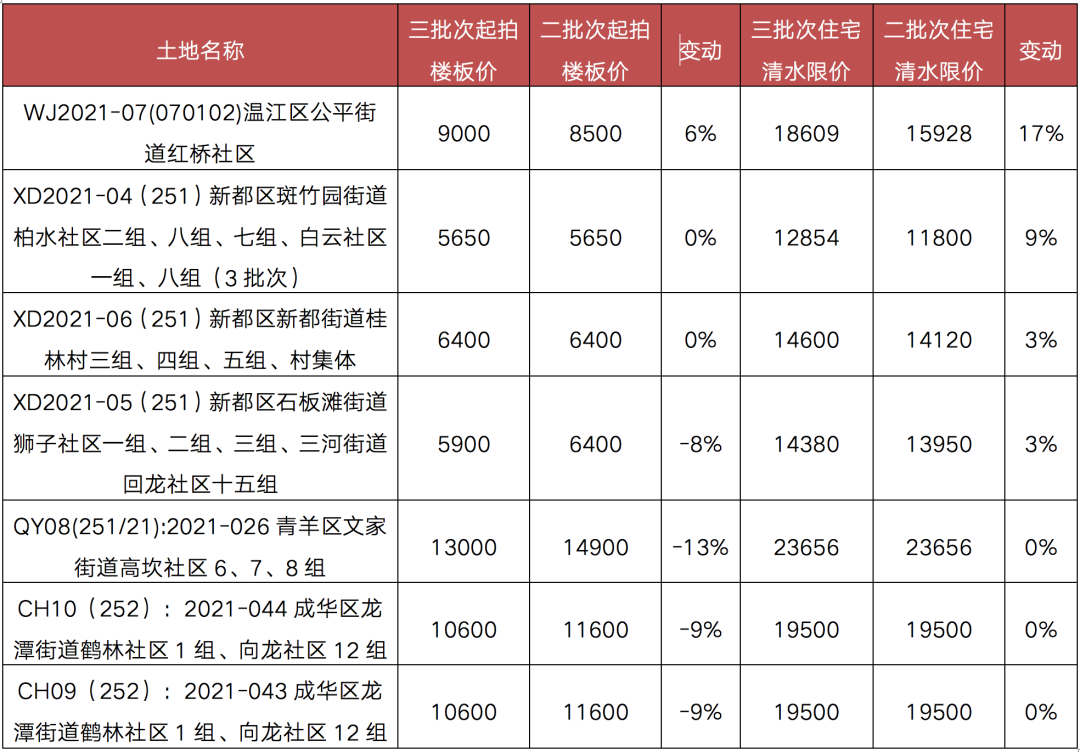值得注意的是,成都第三輪集中供應(yīng)地塊的商品住宅清水限價多較此前明顯提升。如高新區(qū)大源板塊宅地的商品住宅清水限價提升至28500元/平方米,是成都開啟住宅限價以來出讓地塊中商品住宅限價最高的地塊,天府新區(qū)華陽鶴林村地塊的限價也由此前的17700元/平方米提升至2萬元/平方米以上。而在7宗回爐宅地中,多數(shù)地塊的商品住宅限價也給予了抬升,漲幅由3%~17%不等。