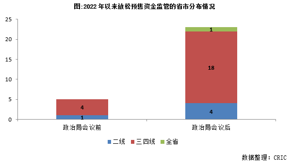 以政治局會議為分界線,預(yù)售資金監(jiān)管政策解綁頻率明顯加快。4月29日,政治局會議強(qiáng)調(diào),支持各地從當(dāng)?shù)貙嶋H出發(fā)完善房地產(chǎn)政策,支持剛性和改善性住房需求,優(yōu)化商品房預(yù)售資金監(jiān)管,促進(jìn)房地產(chǎn)市場平穩(wěn)健康發(fā)展。在此之前,僅南京、煙臺、綿陽等5城放松預(yù)售資金監(jiān)管;而在此之后,已有成都、海口、長春等21省市放松預(yù)售資金監(jiān)管。尤其是三四線城市,政策解綁城市數(shù)量由4城大幅擴(kuò)容至18城,其中不乏徐州、中山、洛陽等強(qiáng)三線城市。