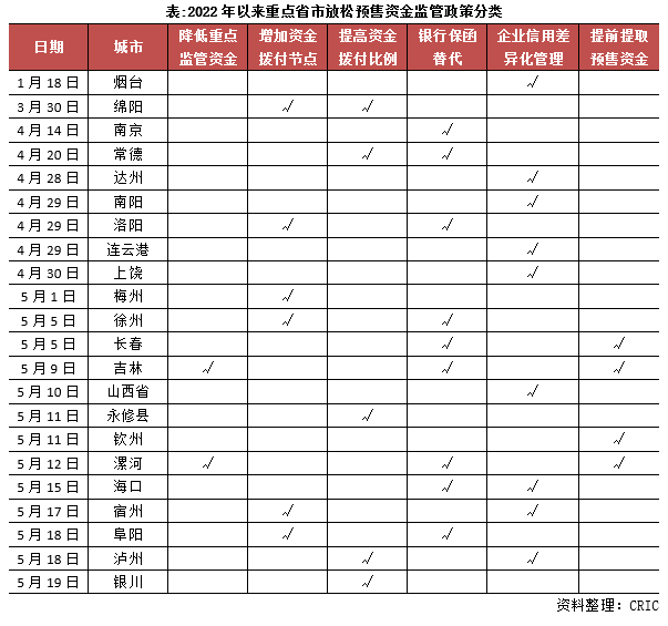 其一,吉林和漯河2城降低重點(diǎn)監(jiān)管資金。例如漯河,對2022年4月1日前辦理商品房預(yù)售許可的項目,不再要求購房款全款繳存監(jiān)管賬戶和重點(diǎn)監(jiān)管資金留存比例;對2022年4月1日后新辦理商品房預(yù)售許可的項目,將商品房預(yù)售重點(diǎn)監(jiān)管資金比例由40%調(diào)整為30%。