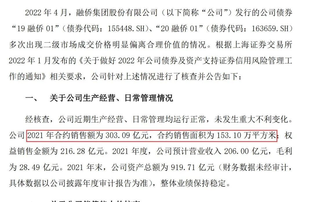以最新數(shù)據(jù)為例,據(jù)融僑集團(tuán)公告披露,2021年其合約銷售額為303.09億元,合約銷售面積為153.10萬平米;權(quán)益銷售金額216.28 億元。2021年預(yù)計(jì)營業(yè)收入206.00億元,毛利28.49億元。2021年末資產(chǎn)總額為919.71億元.