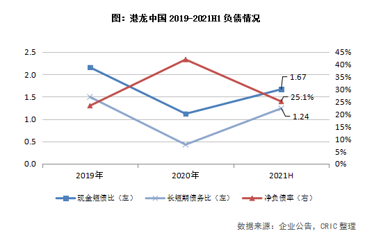 凈負債率和剔除預收款的資產負債率相比期初下降,成功跨入綠檔。截止至2021年6月30日,港龍中國的凈負債率為25.1%,相比于2020年的42%,下降了16.9個百分點,回到2019年水平,遠低于行業平均。剔除預收款的資產負債率達67.7%,較期初下降14.5個百分點,低于三道紅線70%的閾值,成功跨入綠檔。
