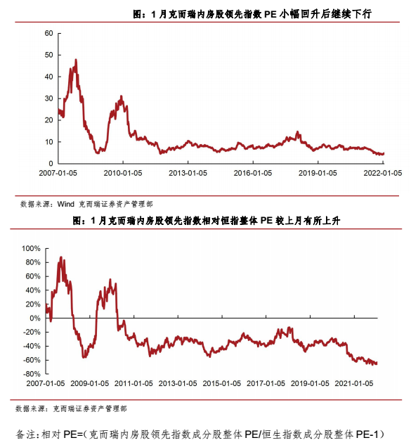 從估值角度看,2022年1月克而瑞內房股領先指數估值在小幅回升后繼續下行,指數相對恒指PE較上月有所上升。