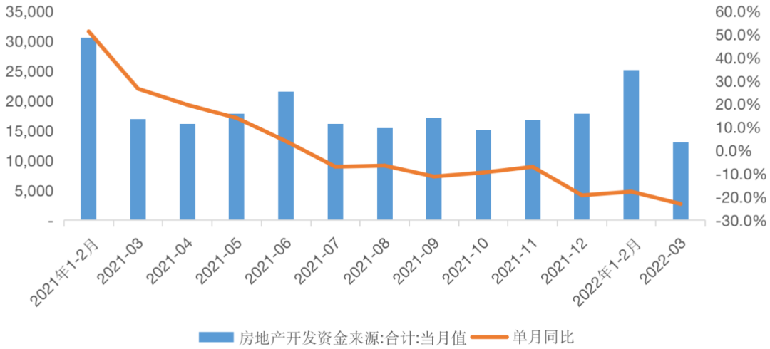 圖:2021年1月-2022年3月房地產(chǎn)開(kāi)發(fā)企業(yè)到位資金(當(dāng)月值)變化情況