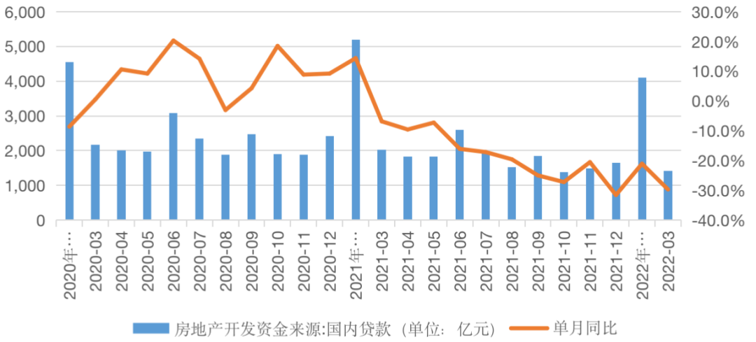 圖:2020年以來(lái)房地產(chǎn)到位資金(國(guó)內(nèi)貸款)當(dāng)月值及同比增速(單位:億元,%)