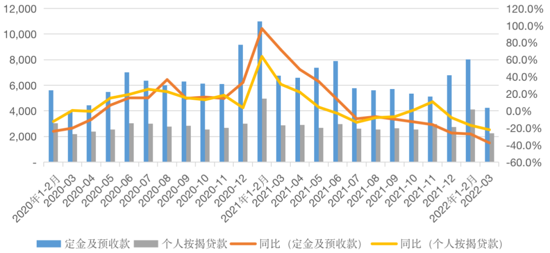 圖:2020年以來(lái)房地產(chǎn)到位資金(定金及預(yù)收款)、(個(gè)人按揭貸款)當(dāng)月值及同比(單位:億元,%)