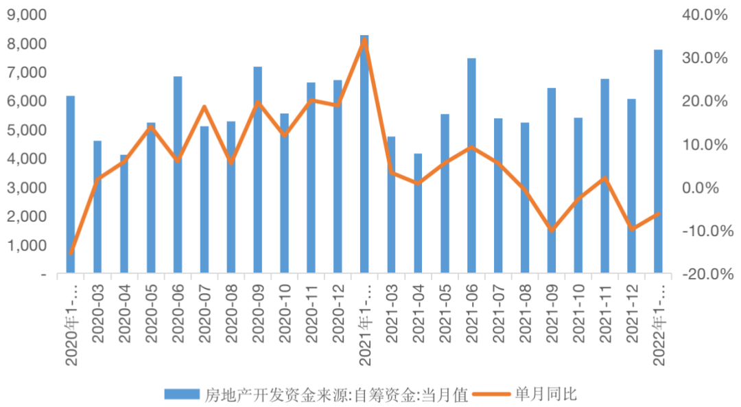 圖:2020年以來(lái)房地產(chǎn)到位資金(自籌資金)當(dāng)月值及同比增速(單位:億元,%)
