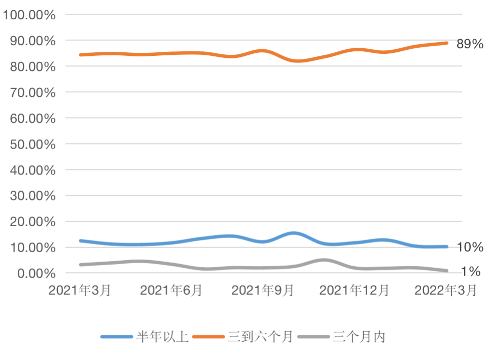 2022年3月,購(gòu)房者信心尚未恢復(fù)。根據(jù)CRIC客戶調(diào)研數(shù)據(jù)顯示,計(jì)劃三個(gè)月內(nèi)買房的客戶比例降至1%,而三到六個(gè)月內(nèi)購(gòu)房需求有所提振,但受困于疫情形勢(shì)越發(fā)嚴(yán)峻,市場(chǎng)熱度尚未回溫。