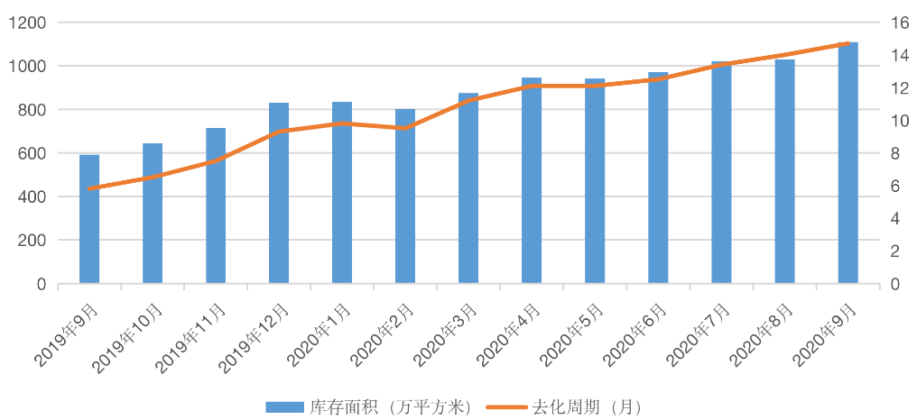 和天津新房市場情況相似,鄭州也面臨著巨大的庫存壓力。克而瑞數據顯示,截至2020年9月,鄭州新房庫存面積已到1108.8萬平方米,去化周期從去年9月的5.8月變成了14.7月。