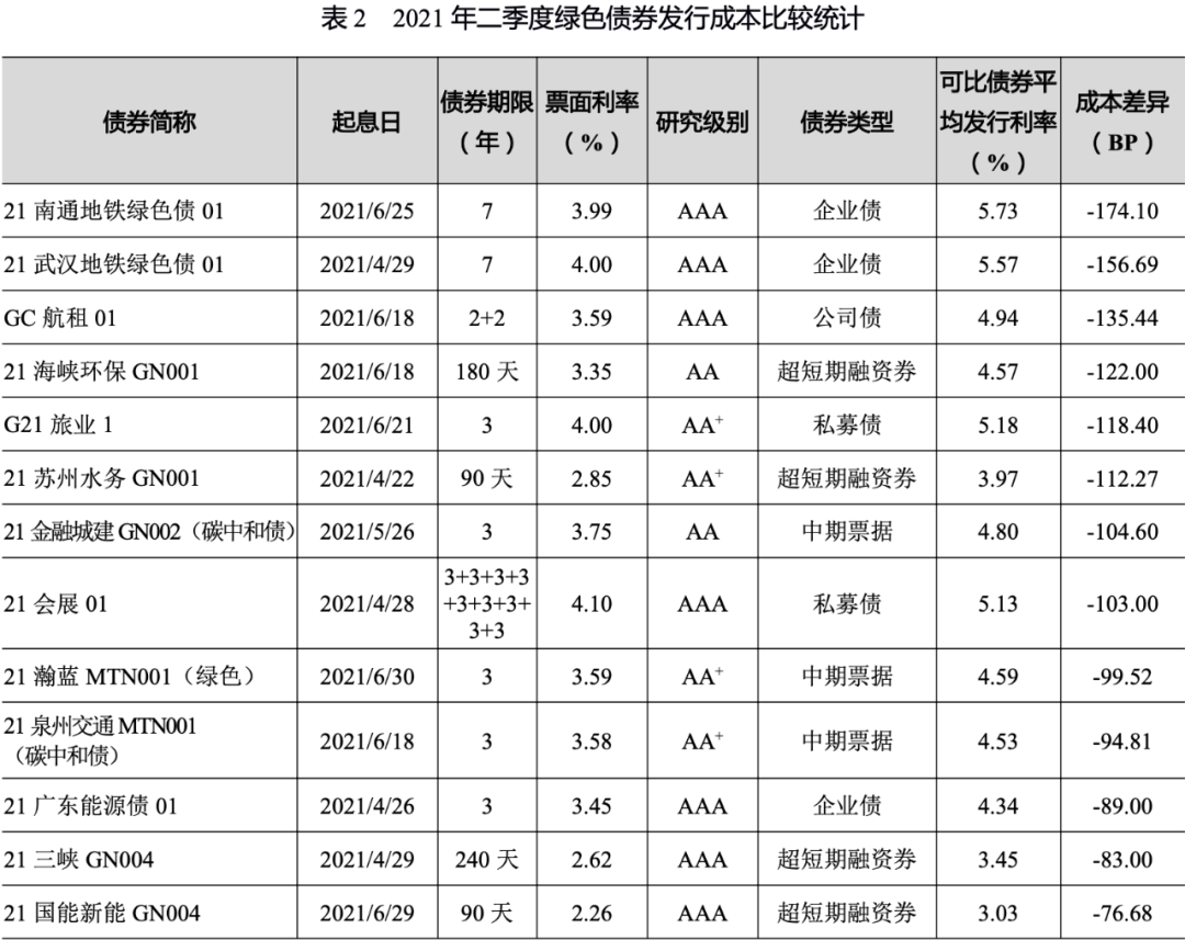 2021年二季度,我國新發綠色債券中有87只擁有可比債券,其中76只呈現成本優勢,占比87.36%。