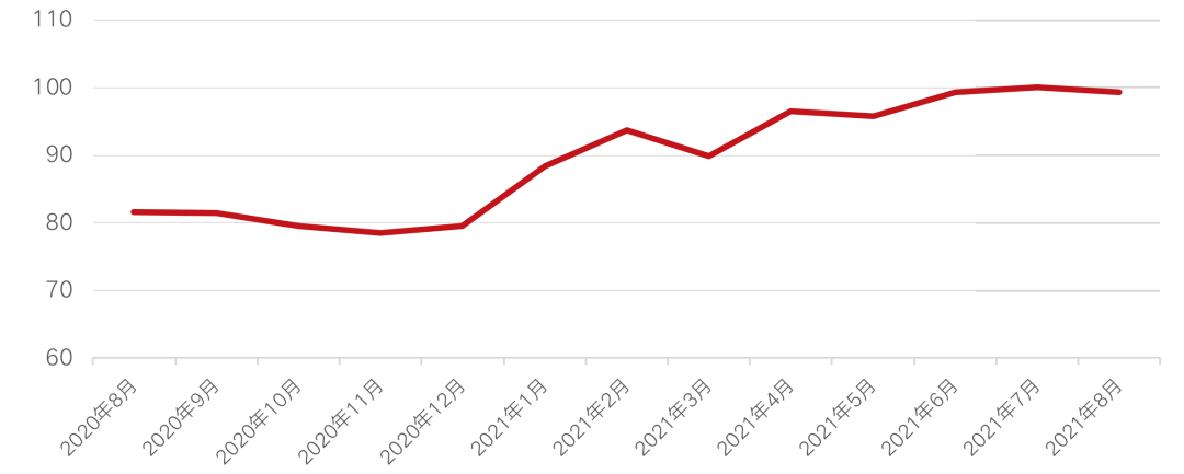 2021年以來,上海的個人房源平均租金整體呈現上升狀態,從去年同期的81.67元/平米/月上漲至2021年7月的100.04元/平米/月,租金水平打破近兩年記錄,并保持連續7個月上漲,同比上漲了22.49%。至8月,上海租金水平有所下降,但仍然保持99.34元/平米/月高位。