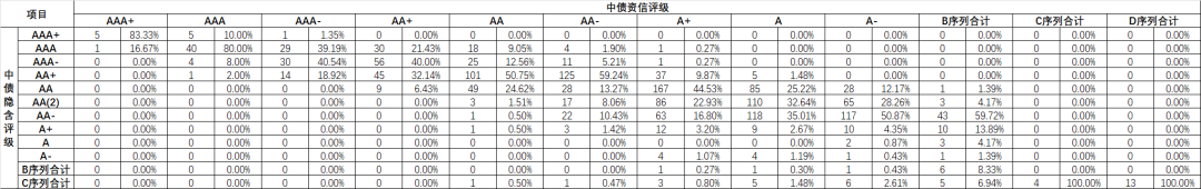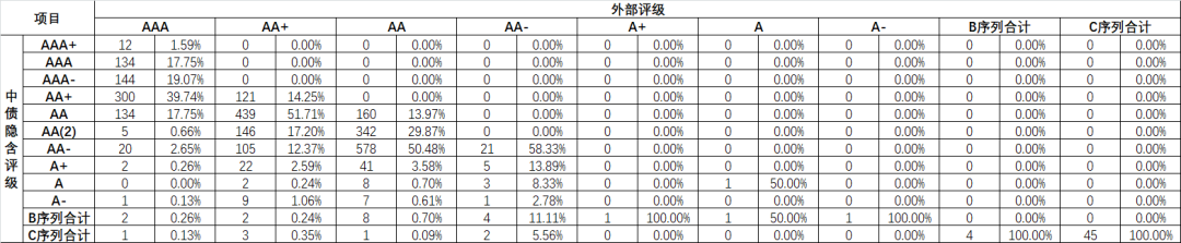 外部評級多集中于AAA、AA+及AA,然而,同樣的AAA,在中債隱含評級中可以區(qū)分為AAA+(1.59%)、AAA(17.75%)、AAA-(19.07%)、AA+(39.74%)以及AA(17.75%)等。