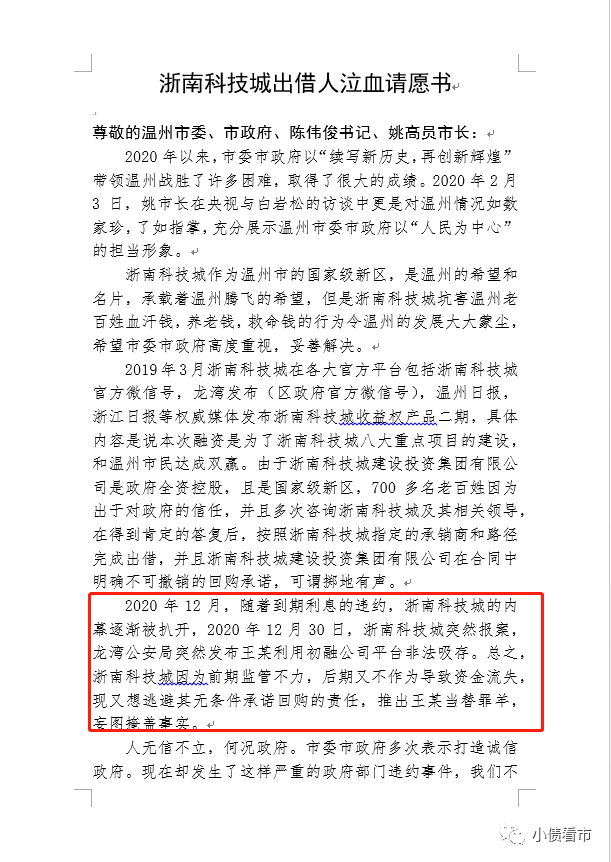 2021年的第一天,一封《浙南科技城出借人泣血請愿書》在網絡流傳,請愿書中寫道“浙南科技城因為前期監管不力,后期不作為導致資金流失,現又想逃避其無條件承諾回購的責任,推出王某當替罪羊,妄圖掩蓋事實。”