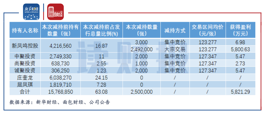 12月7日,公司發(fā)布可轉債減持公告,在2021年10月21日至12月6日期間,控股股東新鳳鳴控股及其一致行動人通過集中競價、大宗交易方式合計減持鳳21轉債250萬張。根據(jù)相應期間鳳21轉債交易均價計算,控股股東及其一致行動人此次通過減持可轉債合計套現(xiàn)3.08億元,合計獲得盈利近5821萬元。