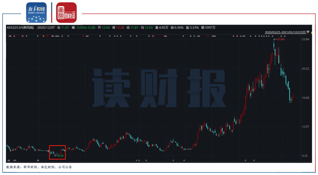 上市公司回購股份計劃往往被市場解讀為利好消息。新鳳鳴發(fā)布回購股份公告后的第二個交易日,即2020年5月25日公司股價便止跌,當日盤中最低價9.35元/股(前復權)也成為公司上市至今股價的最低點。在隨后不到一年時間里,公司股價最高上漲至23.84元/股,漲幅近155%。