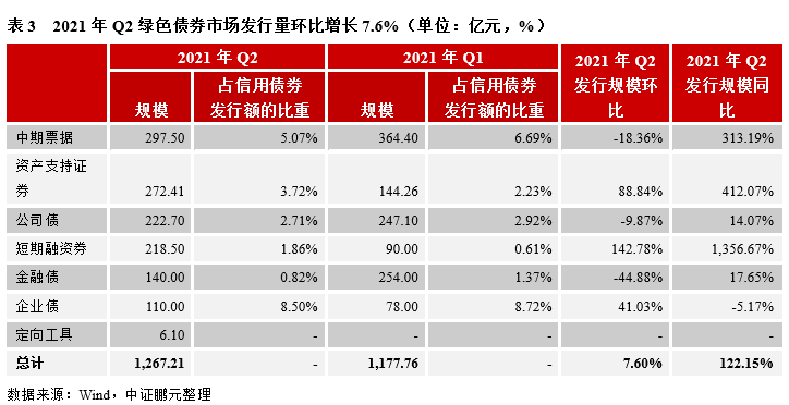 2021年Q2國內市場共發(fā)行綠色債券1,267.21億元,環(huán)比增長7.60%,同比增長122.15%。分債券類型看,2021年Q2綠色債券發(fā)行量最大的依然是中期票據,發(fā)行了297.50億元;其次是資產支持證券,發(fā)行規(guī)模為272.41億元,接下來依次是公司債(222.70億元)、短期融資券(218.50億元),其余品種發(fā)行規(guī)模在150億元以下。環(huán)比來看,綠色短期融資券、綠色資產支持證券、綠色企業(yè)債環(huán)比增幅明顯,綠色中期票據環(huán)比下降18.36%,綠色金融債、綠色公司債發(fā)行規(guī)模環(huán)比也均有下降。同比來看,除綠色企業(yè)債外,其余綠色債券品種均有增長,綠色短期融資券、綠色資產支持證券、綠色中期票據同比增長幅度較大。