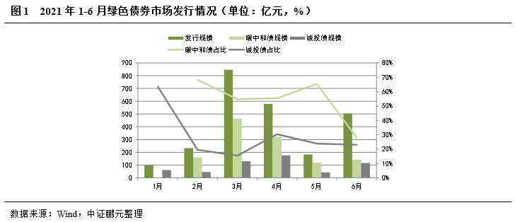 2021年上半年國內市場共發(fā)行綠色債券2,444.96億元,與去年下半年相比,環(huán)比增長113.94%,已超過去年全年綠色債券市場發(fā)行規(guī)模。上半年綠色債券發(fā)行集中在3月、4月和6月。作為今年綠色債券市場的最大亮點,上半年碳中和債共發(fā)行1,206.39億元,占綠色債券總體發(fā)行規(guī)模的49.34%,分月度來看,6月份碳中和債的貼標積極性有所減弱。