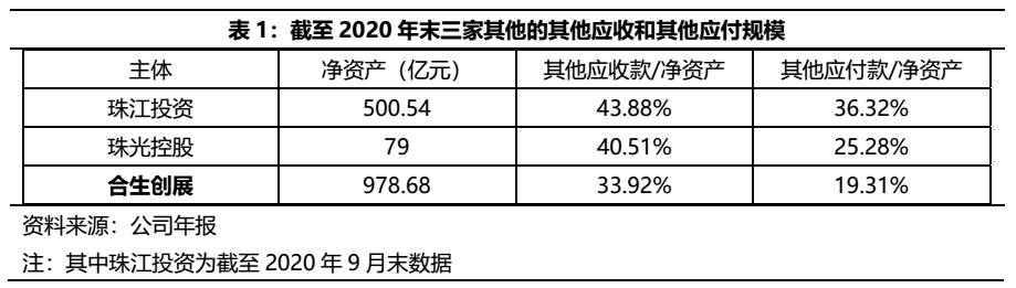 朱氏集團(tuán)旗下產(chǎn)業(yè)主體囊括合生創(chuàng)展、珠江投資、珠光集團(tuán)以及新南方集團(tuán),業(yè)務(wù)多涉及房地產(chǎn)板塊,主體之間的資金往來(lái)密切。從其他應(yīng)收和其他應(yīng)付款規(guī)模上看,合生創(chuàng)展、珠江投資、珠光集團(tuán)三家主體均有一定規(guī)模,科目明細(xì)中,主體之間也有較多的關(guān)聯(lián)。