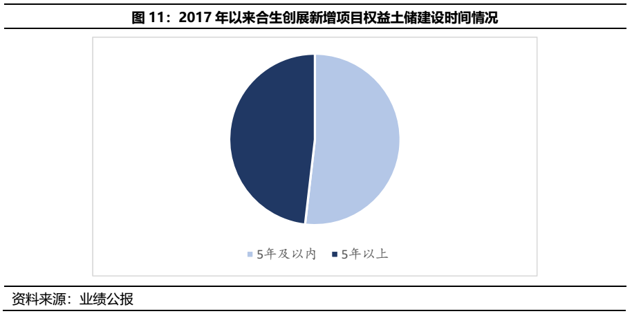 剔除上述的歷史囤地,可以發(fā)現(xiàn)合生創(chuàng)展近年來(lái)加快了高周轉(zhuǎn)項(xiàng)目的布局,2017年后,合生創(chuàng)展新增項(xiàng)目權(quán)益土儲(chǔ)建設(shè)面積中,52%的建設(shè)時(shí)間在5年以內(nèi),建設(shè)時(shí)間5年以上的項(xiàng)目?jī)H兩個(gè),主要是廣州番禺區(qū)南村鎮(zhèn)舊改項(xiàng)目土儲(chǔ)面積較大,放大了這部分的占比。