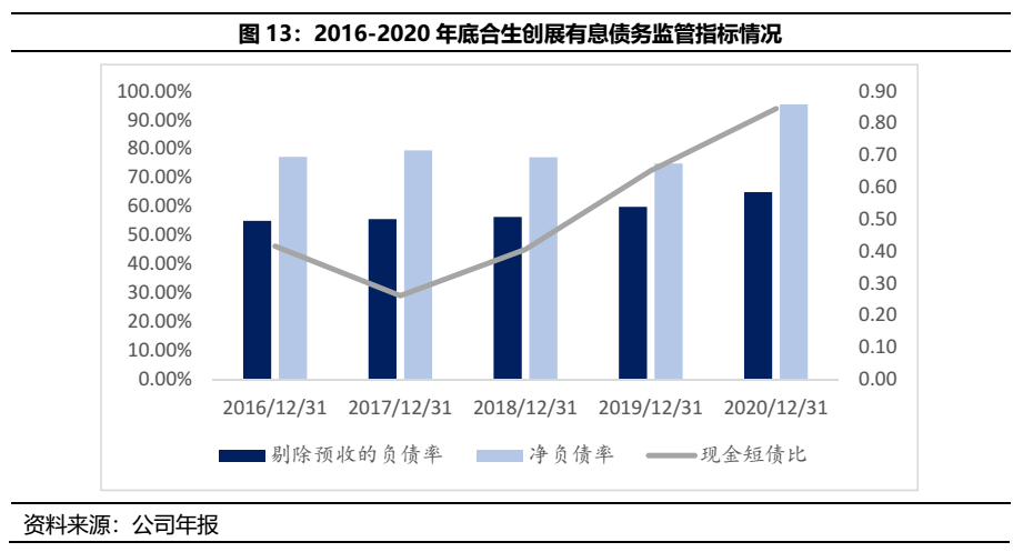 受益于早期囤地的慢周轉(zhuǎn)模式,合生創(chuàng)展的債務(wù)監(jiān)管指標(biāo)總體尚可,僅現(xiàn)金短債比一直較低,近年來(lái)有所改善。截至2020年末,合生創(chuàng)展的剔除預(yù)收的負(fù)債率、凈負(fù)債率、現(xiàn)金短債比分別為64.93%、95.34%、0.84,觸及一條紅線,觸及紅線的現(xiàn)金短債比指標(biāo)近年來(lái)持續(xù)提升。
