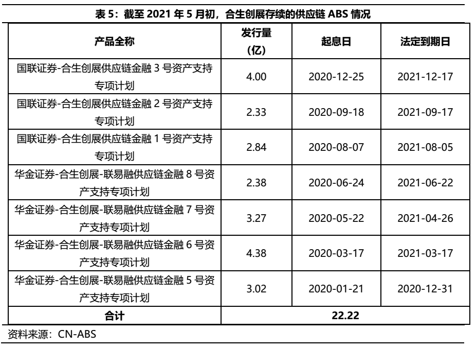 由于一直以來(lái)的低成本囤地和低周轉(zhuǎn)模式,早期舊改和協(xié)議拿地較多,導(dǎo)致合生創(chuàng)展的供應(yīng)鏈ABS存續(xù)規(guī)模較少,多為近期的項(xiàng)目發(fā)行。截至20年5月初,供應(yīng)鏈ABS存量?jī)H約22億元。