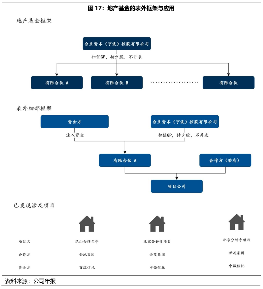 有別于其他地產(chǎn)基金多拓展其他房地產(chǎn)開(kāi)發(fā)商業(yè)務(wù),合生創(chuàng)展的地產(chǎn)基金“合生資本(寧波)控股有限公司”多聚焦于內(nèi)部項(xiàng)目融資,以多層嵌套方式提供表外資金支持。但由于合生創(chuàng)展擴(kuò)張期發(fā)展較晚,目前涉及的表外融資項(xiàng)目規(guī)模較小,建議持續(xù)關(guān)注其后續(xù)擴(kuò)張進(jìn)展。