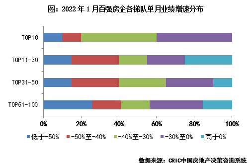 2022年1月,百強(qiáng)房企中多數(shù)規(guī)模房企銷售表現(xiàn)不佳,單月業(yè)績(jī)同比以及較去年月均水平變動(dòng)都有明顯下降。具體來看,1月近9成百強(qiáng)房企單月業(yè)績(jī)同比降低,其中2成房企降幅在30%至40%之間,近4成房企降幅高于40%。龍頭房企中,萬科、恒大單月業(yè)績(jī)降幅明顯,分別達(dá)到53.1%和94.9%。1月,僅仁恒、華發(fā)、濱江、建業(yè)等少數(shù)企業(yè)實(shí)現(xiàn)了單月業(yè)績(jī)同比增長(zhǎng)。