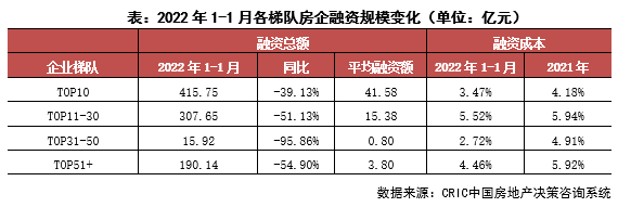 企業(yè)表現(xiàn):本月融資總量最高的企業(yè)為萬科地產(chǎn),融資總量約124.16億元,主要是發(fā)行了30億元的中期票據(jù),此外進(jìn)行了資產(chǎn)證券化產(chǎn)品的發(fā)行。從企業(yè)梯隊(duì)來看,2022年1月TOP10房企融資平均額41.58億元最大,融資總額同比下降39.13%,下降幅度最小;TOP31-50房企融資額僅有15.92億元,該梯隊(duì)進(jìn)行融資的企業(yè)相對(duì)較少。成本來看,TOP31-50梯隊(duì)的房企融資成本最低,為2.72%,其較2021年全年下降2.19pct,降幅最大;而TOP11-30的融資成本最高,為5.52%。