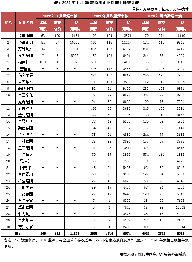 2022年開年首月,30家監(jiān)測(cè)房企土地投資處于低位,新增土地成交建面、總價(jià)相比2021年及2020年年均都有大幅收窄,受投資結(jié)構(gòu)等影響,平均樓板價(jià)11371元/平方米。本月30家典型房企新增土儲(chǔ)總建面169萬平方米,環(huán)比下降87%;新增土地成交價(jià)格192億元,環(huán)比下降83%。平均樓板價(jià)11371元/平方米,與上月相比上升30%。主要由于投資量少且相對(duì)集中,拉高整體平均樓板價(jià)。