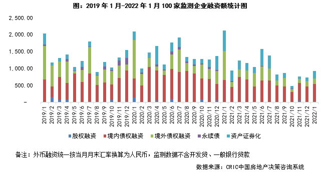 融資總量:2022年1月100家典型房企的融資總量為929.46億元,環(huán)比上升26%,同比下降56%。自2019年以來,每年年初房企融資量都相對(duì)較大,均超過2000億元,而本月融資量不足千億元,一方面在當(dāng)前房企危機(jī)仍未全面解除的情況下,金融機(jī)構(gòu)當(dāng)前白名單企業(yè)相對(duì)較少,放款較為謹(jǐn)慎;另一方面,部分企業(yè)為緩解年初的償債壓力已提前償還部分債券,同時(shí)減少新增融資計(jì)劃,導(dǎo)致融資量同比下滑較大。從融資結(jié)構(gòu)來看,境內(nèi)債權(quán)融資499.08億元,環(huán)比上升9.8%,同比下降24.6%;境外債權(quán)融資169.66億元,環(huán)比上升10.0%,同比下降80.1%;本月資產(chǎn)證券化有所回升,融資223.01億元,環(huán)比上升97.9%,同比下降63.0%。